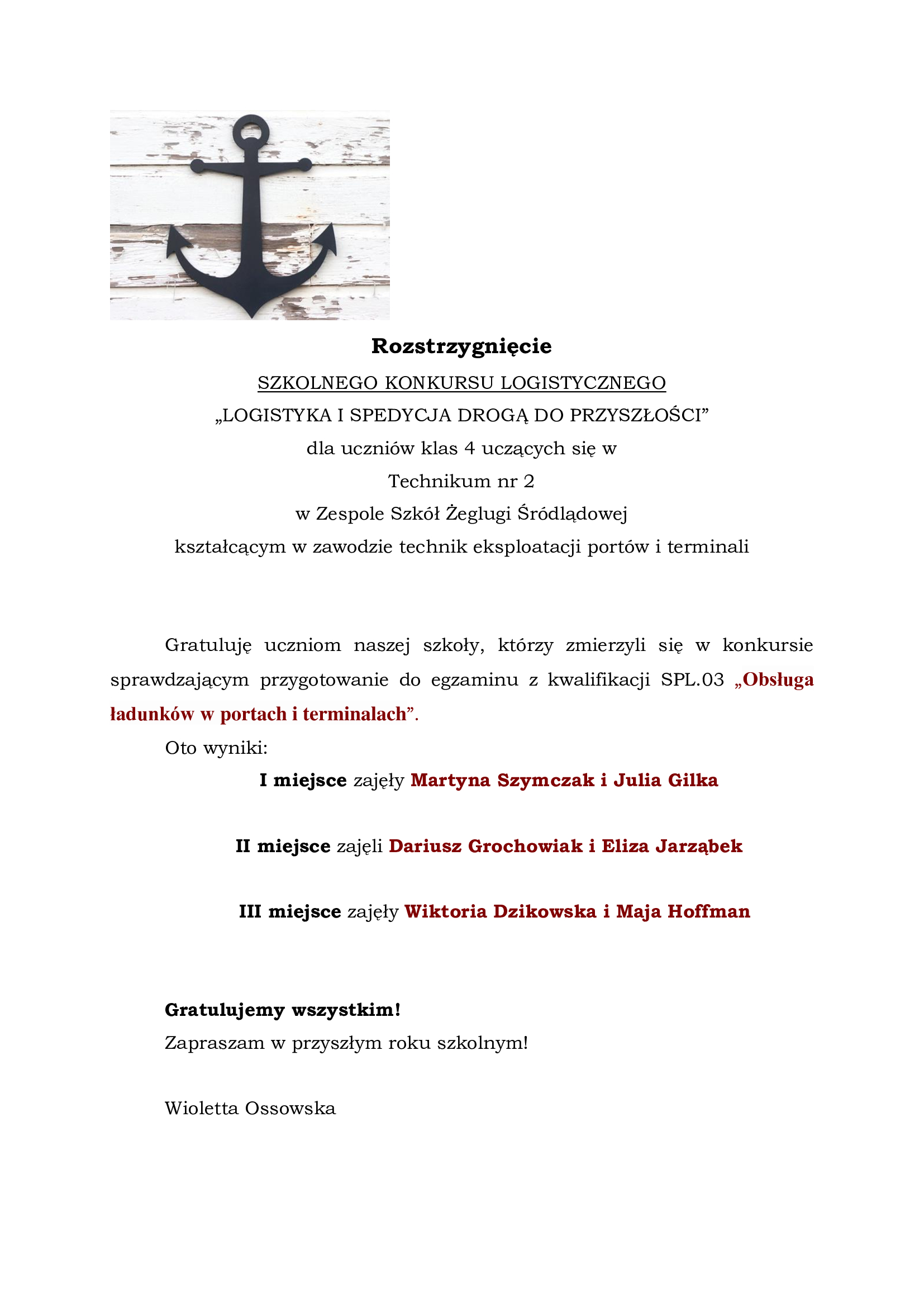 Rozstrzygnięcie SZKOLNEGO KONKURSU LOGISTYCZNEGO „LOGISTYKA I SPEDYCJA DROGĄ DO PRZYSZŁOŚCI” 02-03-2026Data publikacji, 02-03-2026, Michał SwobodaAutor, Michał Swoboda, 61Ilość wyświetleń, 61 Archiwum