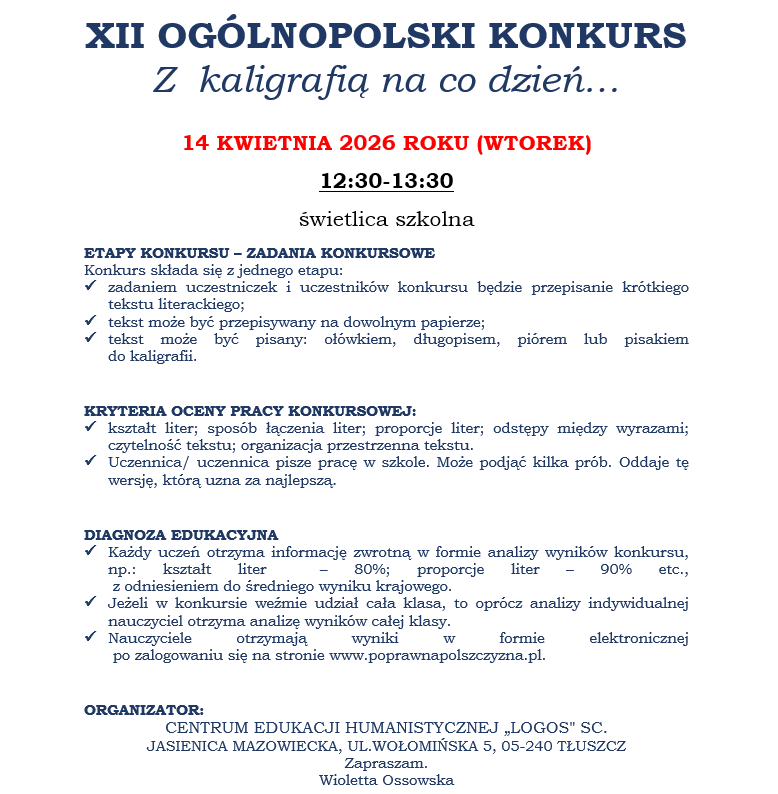 XII OGÓLNOPOLSKI KONKURS Z kaligrafią na co dzień… 18-03-2026Data publikacji, 18-03-2026, Michał SwobodaAutor, Michał Swoboda, 145Ilość wyświetleń, 145 Archiwum